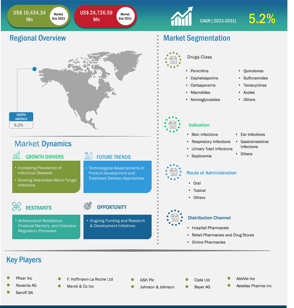 The North America antibiotics & antimycotics market size is expected to reach US$ 24,726.59 million by 2031 from US$ 16,434.34 million in 2023. The market is estimated to record a CAGR of 5.2% from 2023 to 2031.