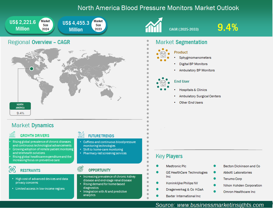 The North America Blood Pressure Monitors Market is valued at US$ 2,221.6 Million in 2024, it is projected to reach US$ 4,455.3 Million by 2033.