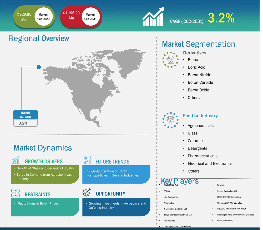 As per our report North America Boron Market, the market size is valued at US$ 929.85 Million in 2023, projecting it to reach US$ 1,196.20 Million by 2031. This translates to a CAGR of approximately 3.2% during the forecast period.