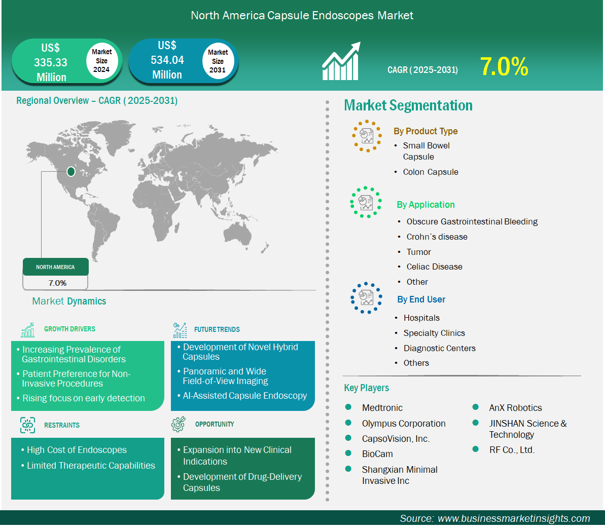 The North America Capsule Endoscopes Market is valued at US$ 335.33 Million in 2024, it is projected to reach US$ 534.04 Million by 2031.