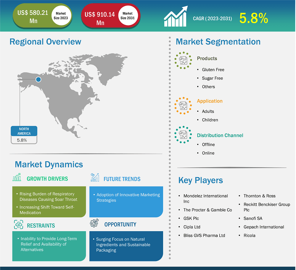 The North America Cough Drops Market is valued at US$ 580.21 Million in 2023, it is projected to reach US$ 910.14 Million by 2031.