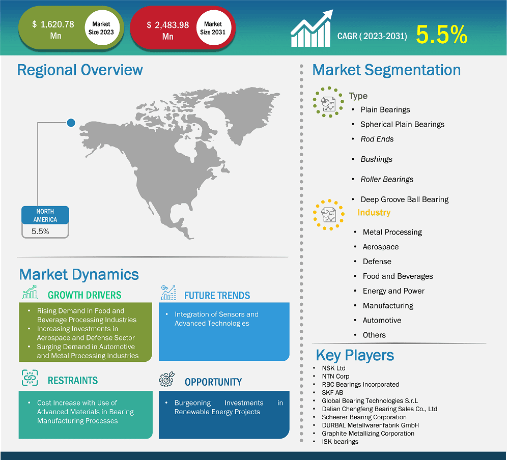 The North America high heat bearing market size is expected to reach US$ 2,483.98 million by 2031 from US$ 1,620.78 million in 2023. The market is estimated to record a CAGR of 5.5% from 2023 to 2031.