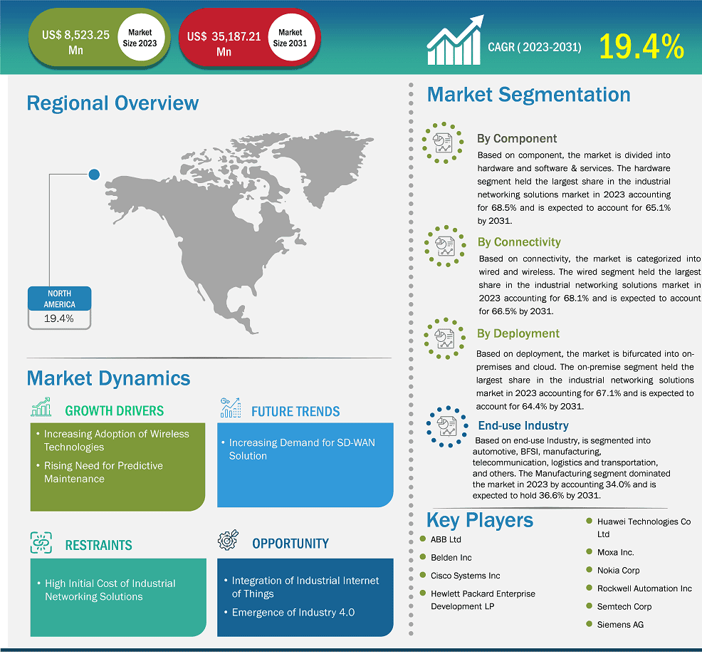 The North America Industrial Networking Solution Market is valued at US$ 8,523.25 Million in 2023, it is projected to reach US$ 35,187.21 Million by 2031.