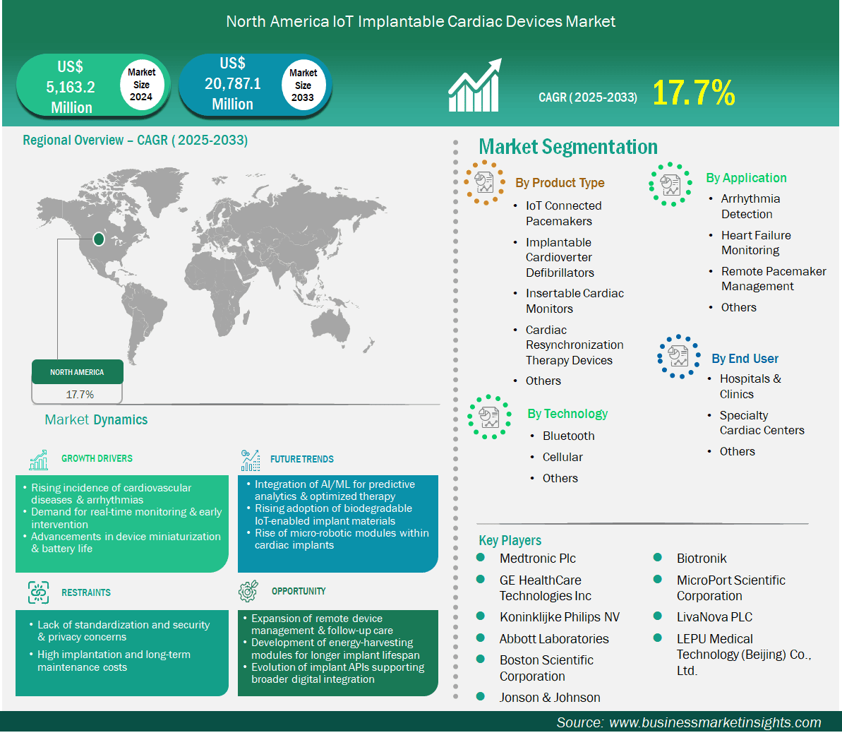 As per our report North America IoT Implantable Cardiac Devices Market, the market size is valued at US$ 5,163.2 Million in 2024, projecting it to reach US$ 20,787.1 Million by 2033. This translates to a CAGR of approximately 17.7% during the forecast period.