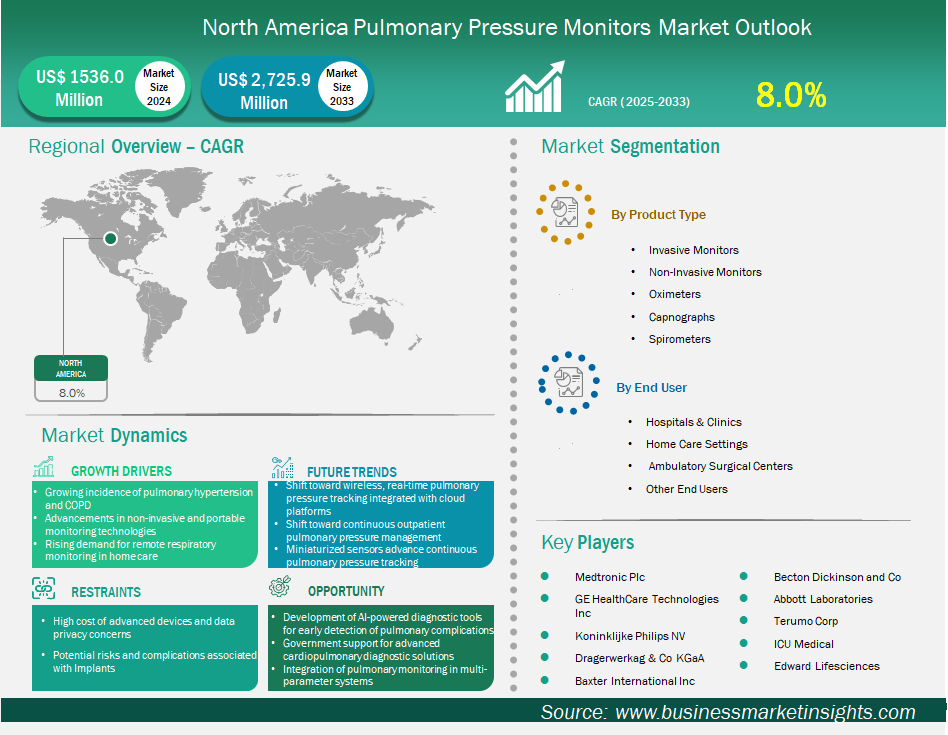 As per our report North America Pulmonary Pressure Monitors Market, the market size is valued at US$ 1,536.1 Million in 2024, projecting it to reach US$ 2,725.9 Million by 2033. This translates to a CAGR of approximately 8.0% during the forecast period.