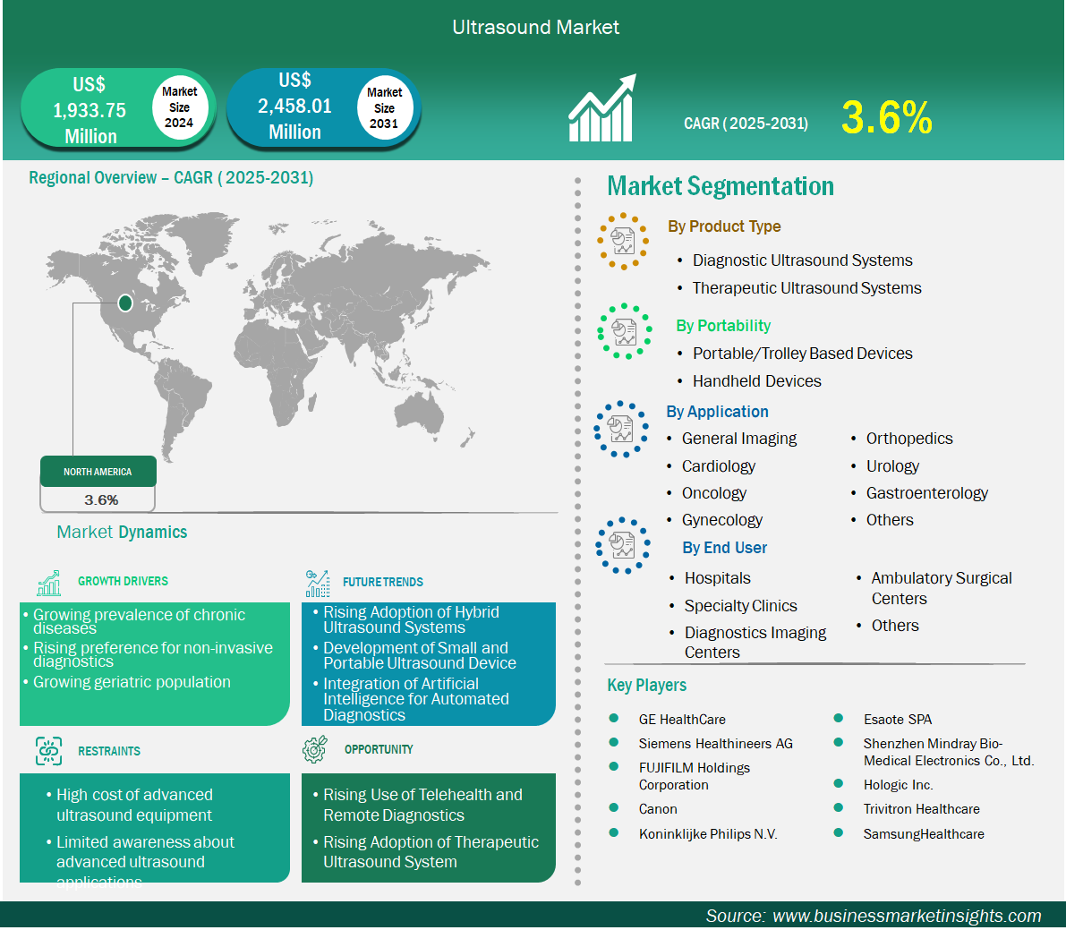 As per our report North America Ultrasound Market, the market size is valued at US$ 1,933.75 Million in 2024, projecting it to reach US$ 2,458.01 Million by 2031. This translates to a CAGR of approximately 3.6% during the forecast period.