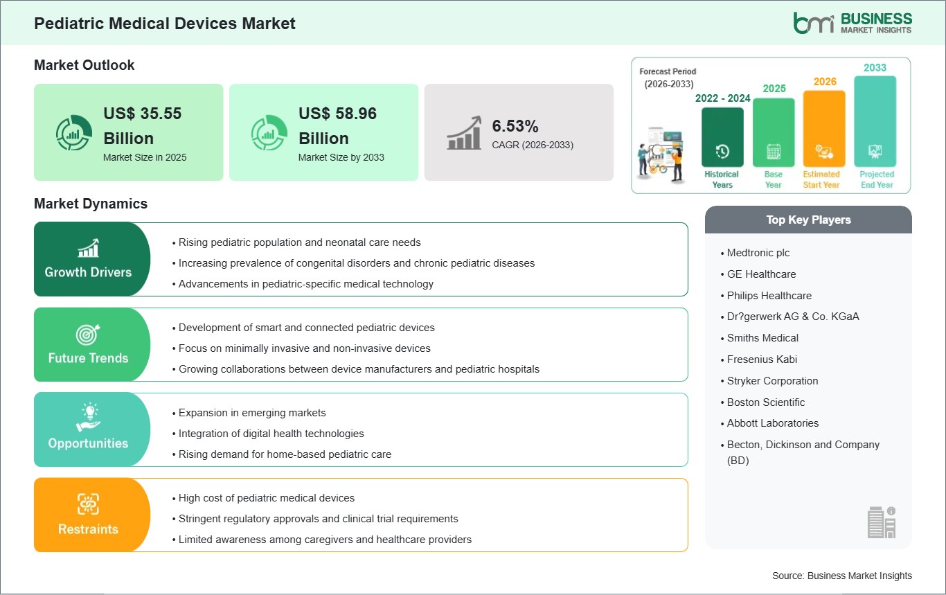 The Pediatric Medical Devices Market is valued at US$ 35.55 Billion in 2025, it is projected to reach US$ 58.96 Billion by 2033.
