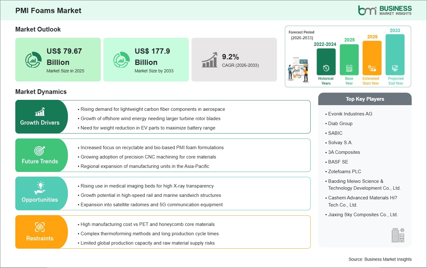 The PMI Foams Market is valued at US$ 79.67 Billion in 2025, it is projected to reach US$ 177.9 Billion by 2033.