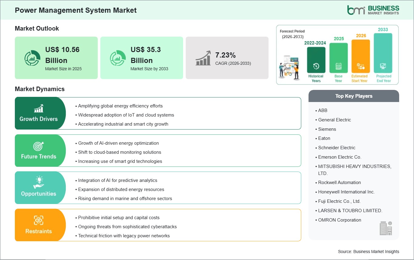 As per our report Power Management System Market, the market size is valued at US$ 10.56 Billion in 2025, projecting it to reach US$ 35.3 Billion by 2033. This translates to a CAGR of approximately 7.23% during the forecast period.