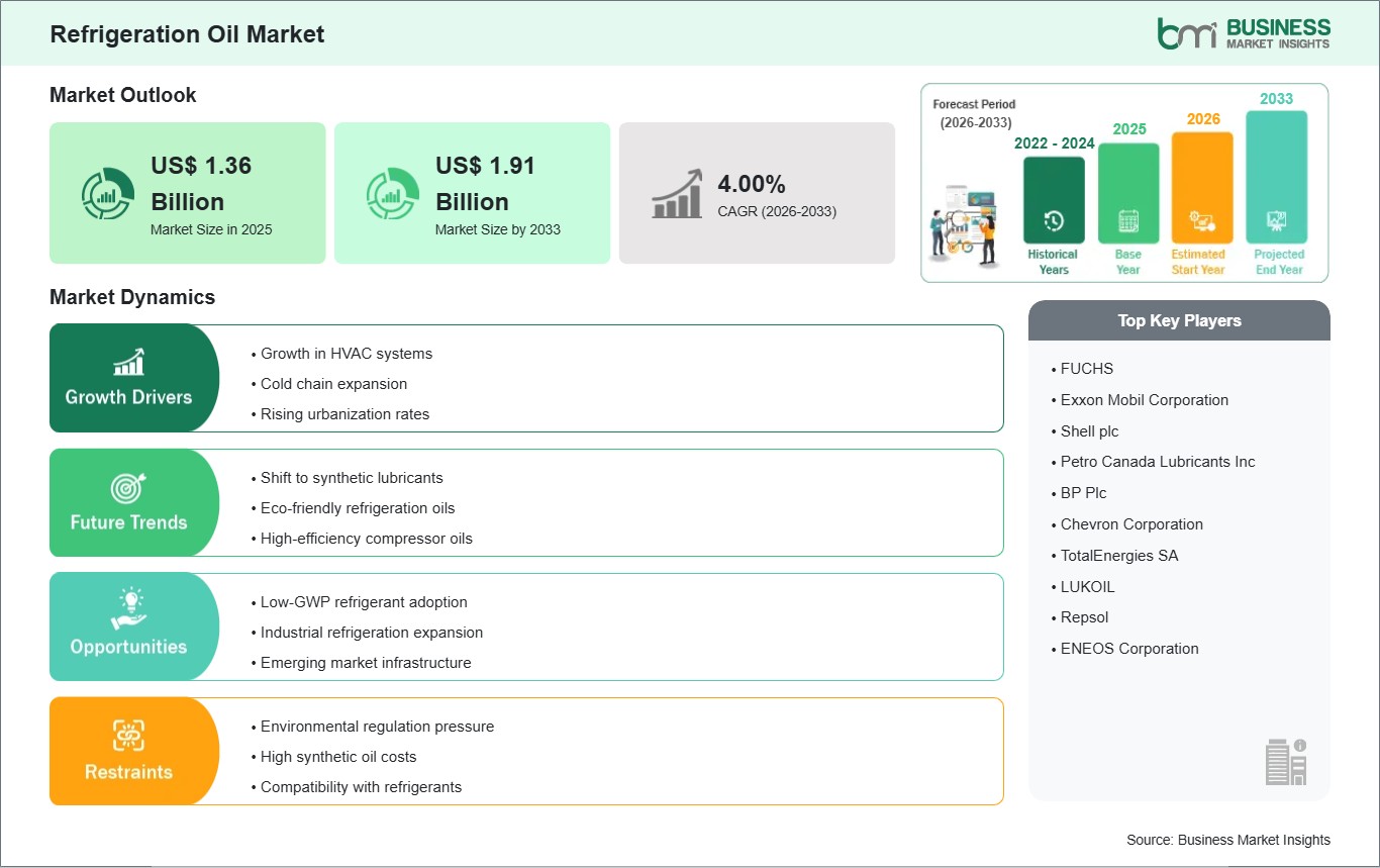 As per our report Refrigeration Oil Market, the market size is valued at US$ 1.36 Billion in 2025, projecting it to reach US$ 1.91 Billion by 2033. This translates to a CAGR of approximately 4.00% during the forecast period.