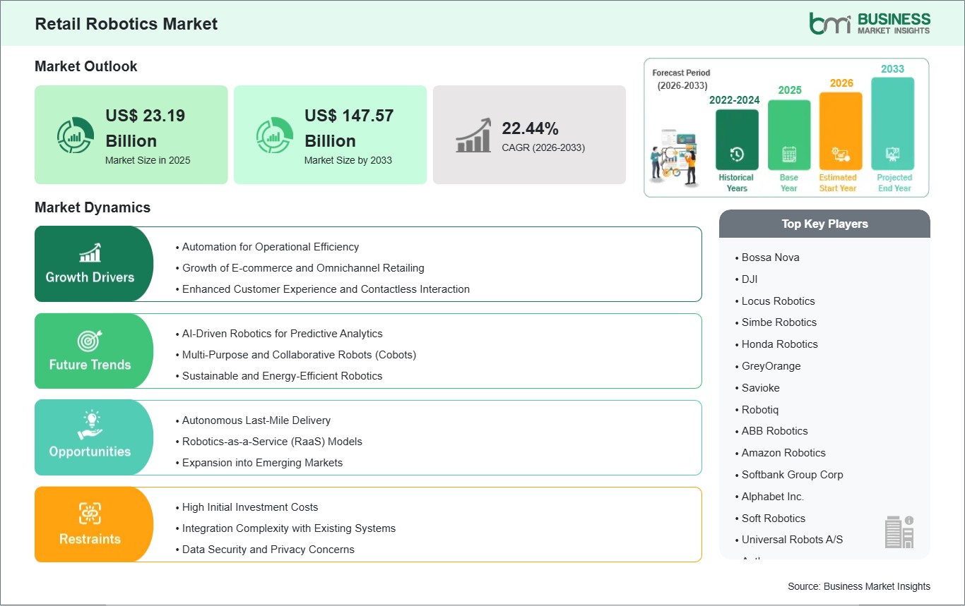 As per our report Retail Robotics Market, the market size is valued at US$ 23.19 Billion in 2025, projecting it to reach US$ 147.57 Billion by 2033. This translates to a CAGR of approximately 22.44% during the forecast period.