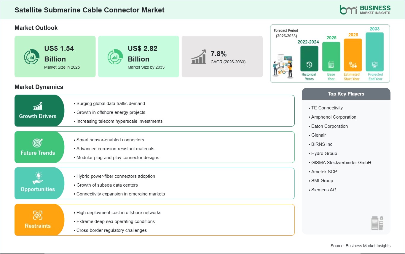 The Satellite Submarine Cable Connector market size is expected to reach US$ 2.82 billion by 2033 from US$ 1.54 billion in 2025. The market is estimated to record a CAGR of 7.8% from 2026 to 2033.