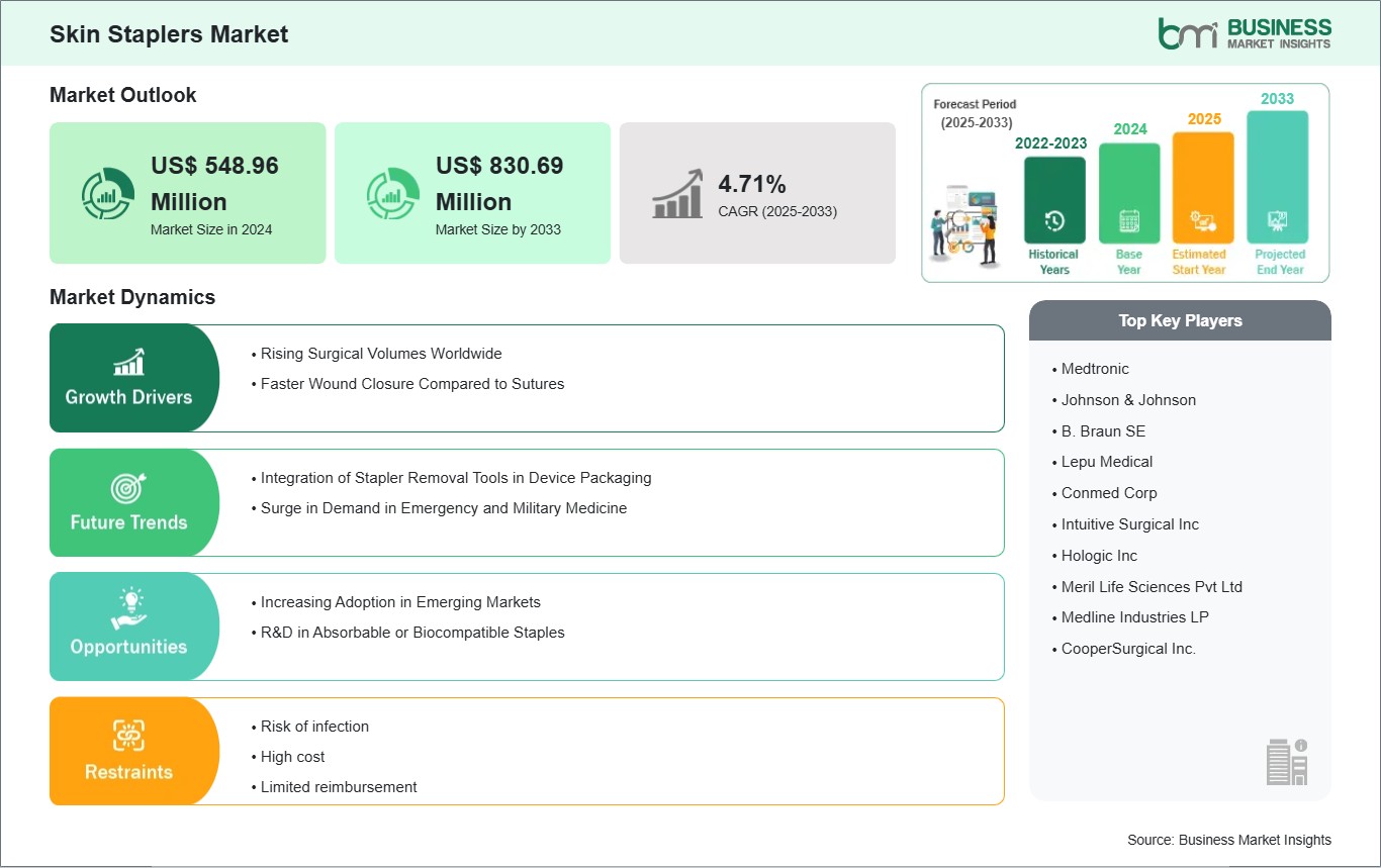 The Skin Staplers Market size is expected to reach US$ 830.69 Million by 2033 from US$ 548.96 Million in 2024. The market is estimated to record a CAGR of 4.71% from 2025 to 2033.