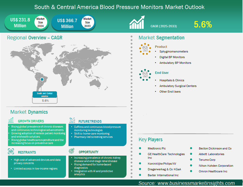 The South and Central America blood pressure monitors market size is expected to reach US$ 366.7 million by 2033 from US$ 231.8 million in 2024. The market is estimated to record a CAGR of 5.6% from 2025 to 2033.
