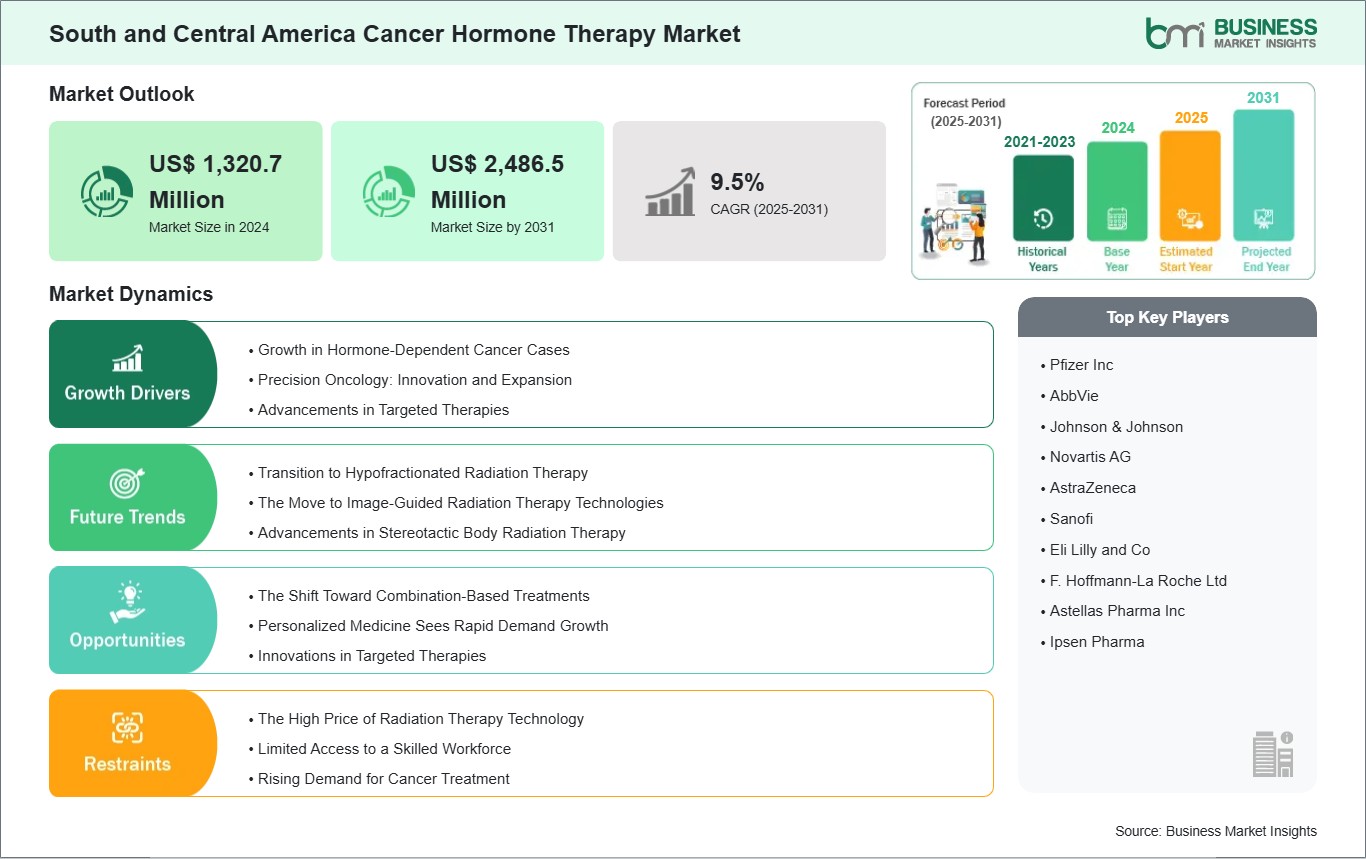 The South and Central America Cancer Hormone Therapy Market is valued at US$ 1,320.7 Million in 2024, it is projected to reach US$ 2,486.5 Million by 2031.
