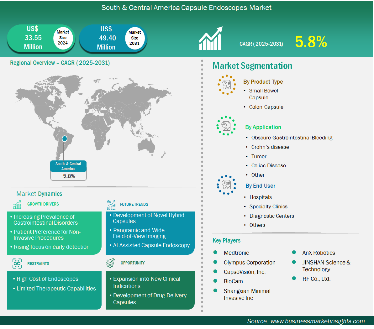 The South and Central America capsule endoscopes market size is expected to reach US$ 49.40 million by 2031 from US$ 33.55 million in 2024. The market is estimated to record a CAGR of 5.8% from 2025 to 2031.