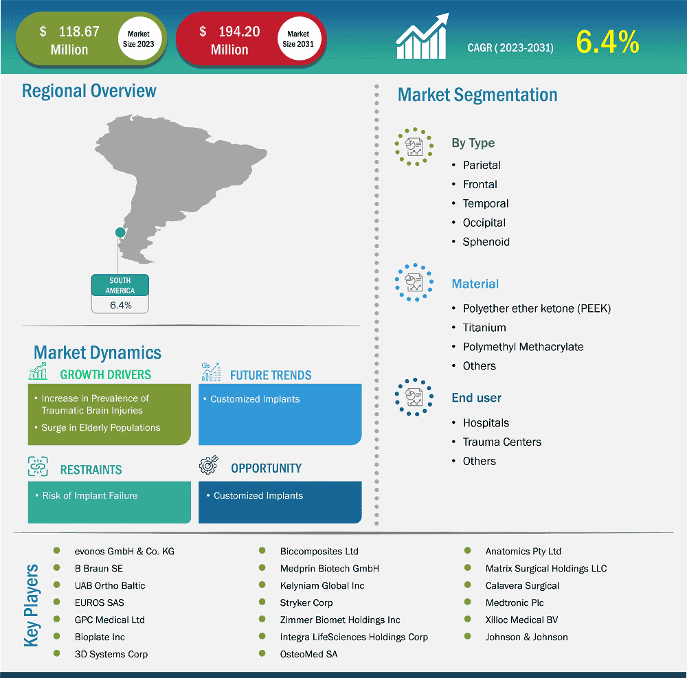 The South & Central America cranial implants market size is expected to reach US$ 194.20 million by 2031 from US$ 118.67 million in 2023. The market is estimated to record a CAGR of 6.4% from 2023 to 2031.