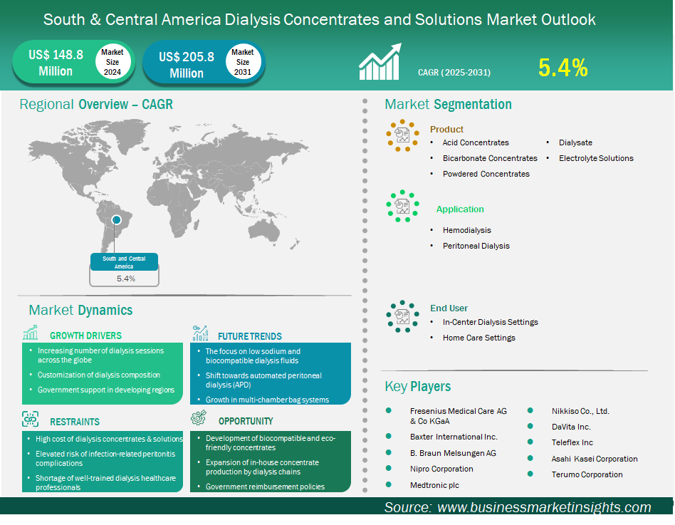 The South and Central America Dialysis Concentrates and Solutions Market is valued at US$ 148.8 Million in 2024, it is projected to reach US$ 205.8 Million by 2031.