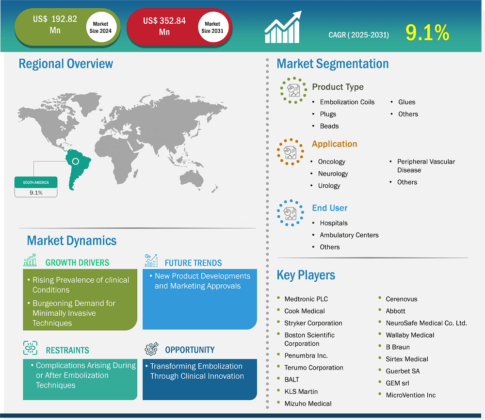 The South & Central America Embolization Devices Market is valued at US$ 192.82 Million in 2024, it is projected to reach US$ 352.84 Million by 2031.
