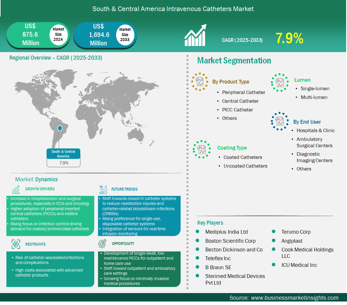 As per our report South and Central America Intravenous Catheters Market, the market size is valued at US$ 875.6 Million in 2024, projecting it to reach US$ 1,694.6 Million by 2033. This translates to a CAGR of approximately 7.9% during the forecast period.