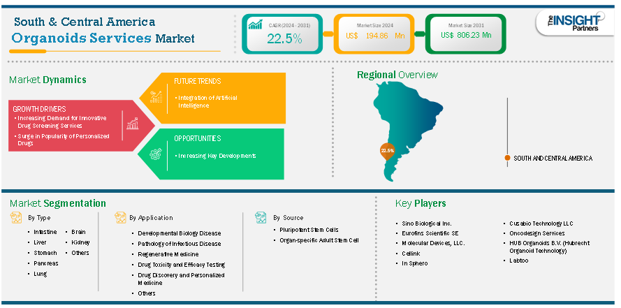 As per our report South & Central America Organoids Services Market, the market size is valued at US$ 194.86 Million in 2024, projecting it to reach US$ 806.23 Million by 2031. This translates to a CAGR of approximately 22.5% during the forecast period.