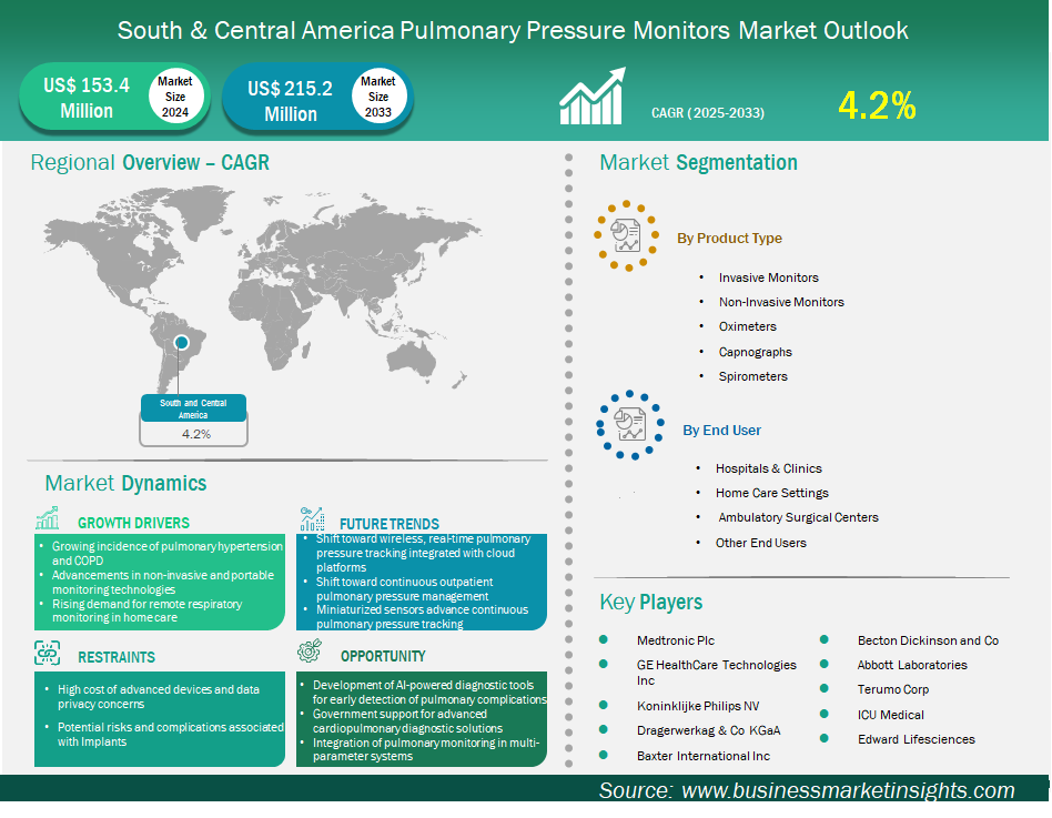 The South and Central America pulmonary pressure monitors market size is expected to reach US$ 215.2 million by 2033 from US$ 153.4 million in 2024. The market is estimated to record a CAGR of 4.2% from 2025 to 2033.