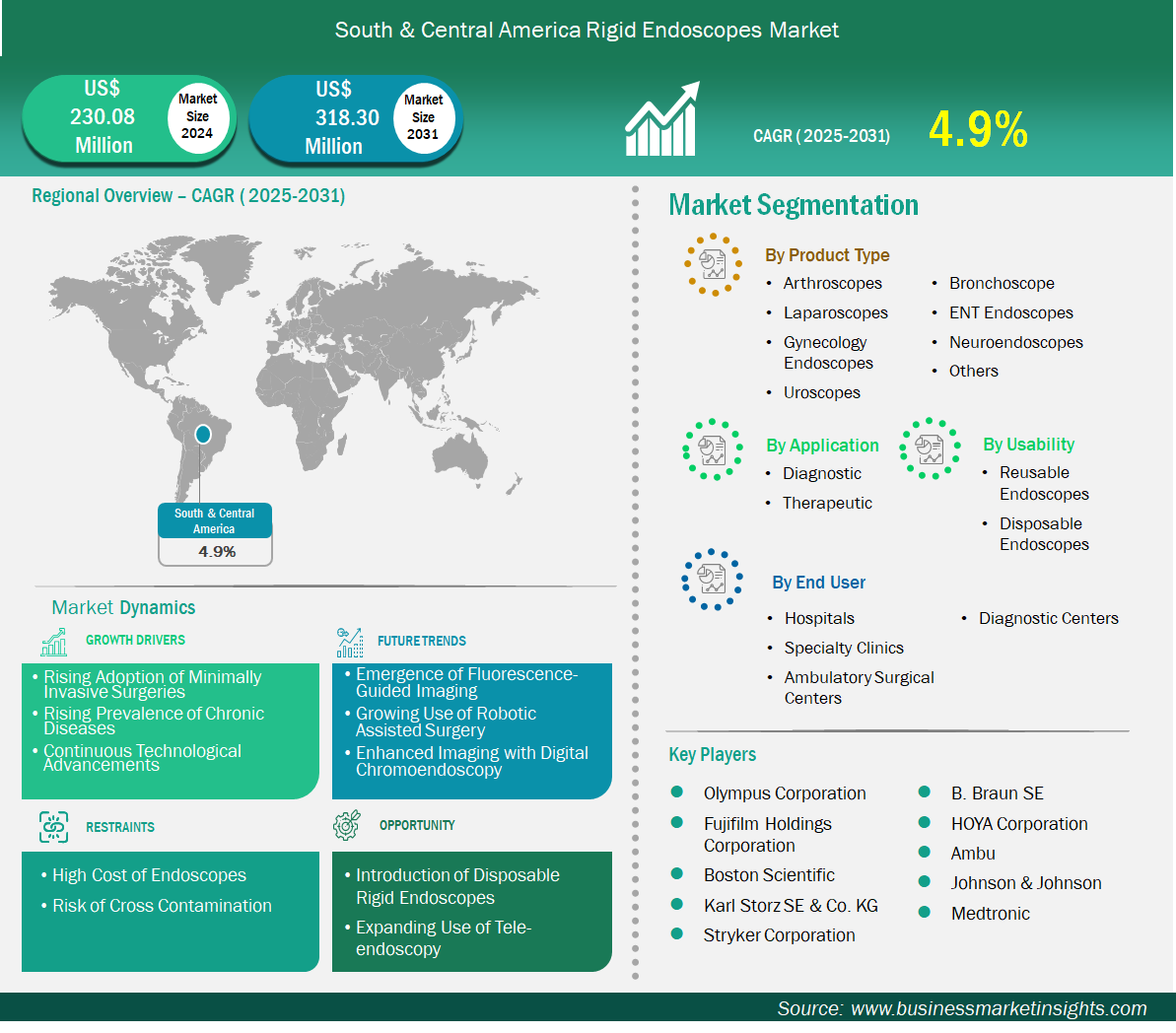 The South and Central America Rigid Endoscopes Market is valued at US$ 230.08 Million in 2024, it is projected to reach US$ 318.30 Million by 2031.