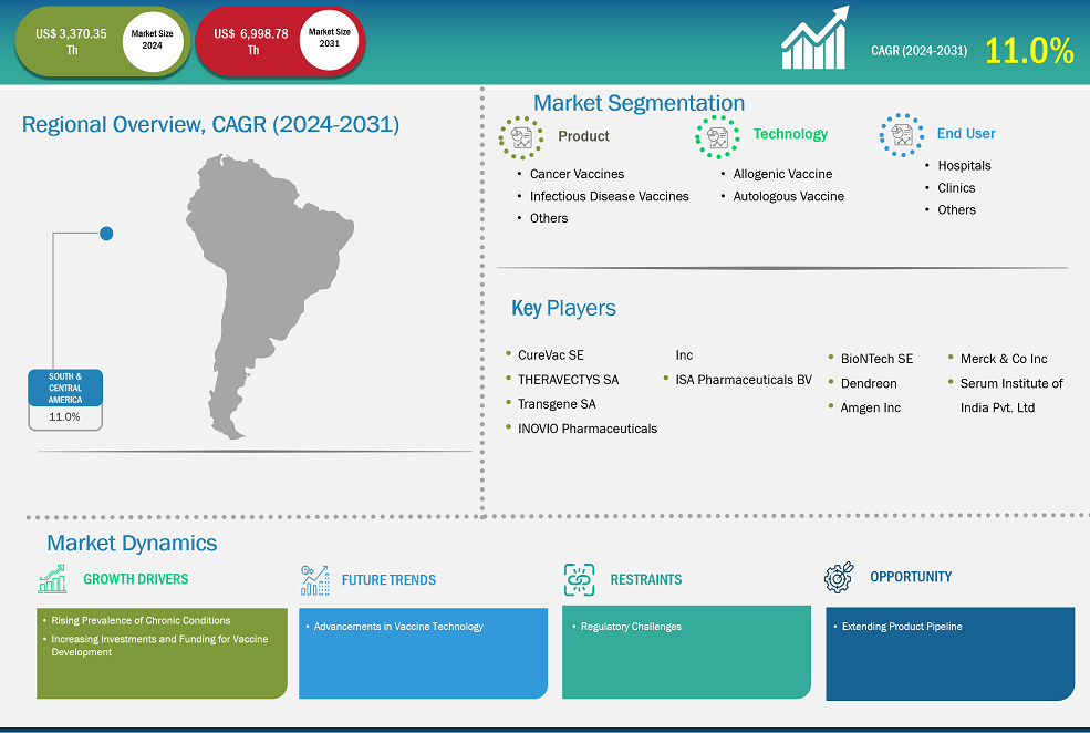 The South & Central America Therapeutic Vaccines Market is valued at US$ 3,370.35 Thousand in 2024, it is projected to reach US$ 6,998.78 Thousand by 2031.