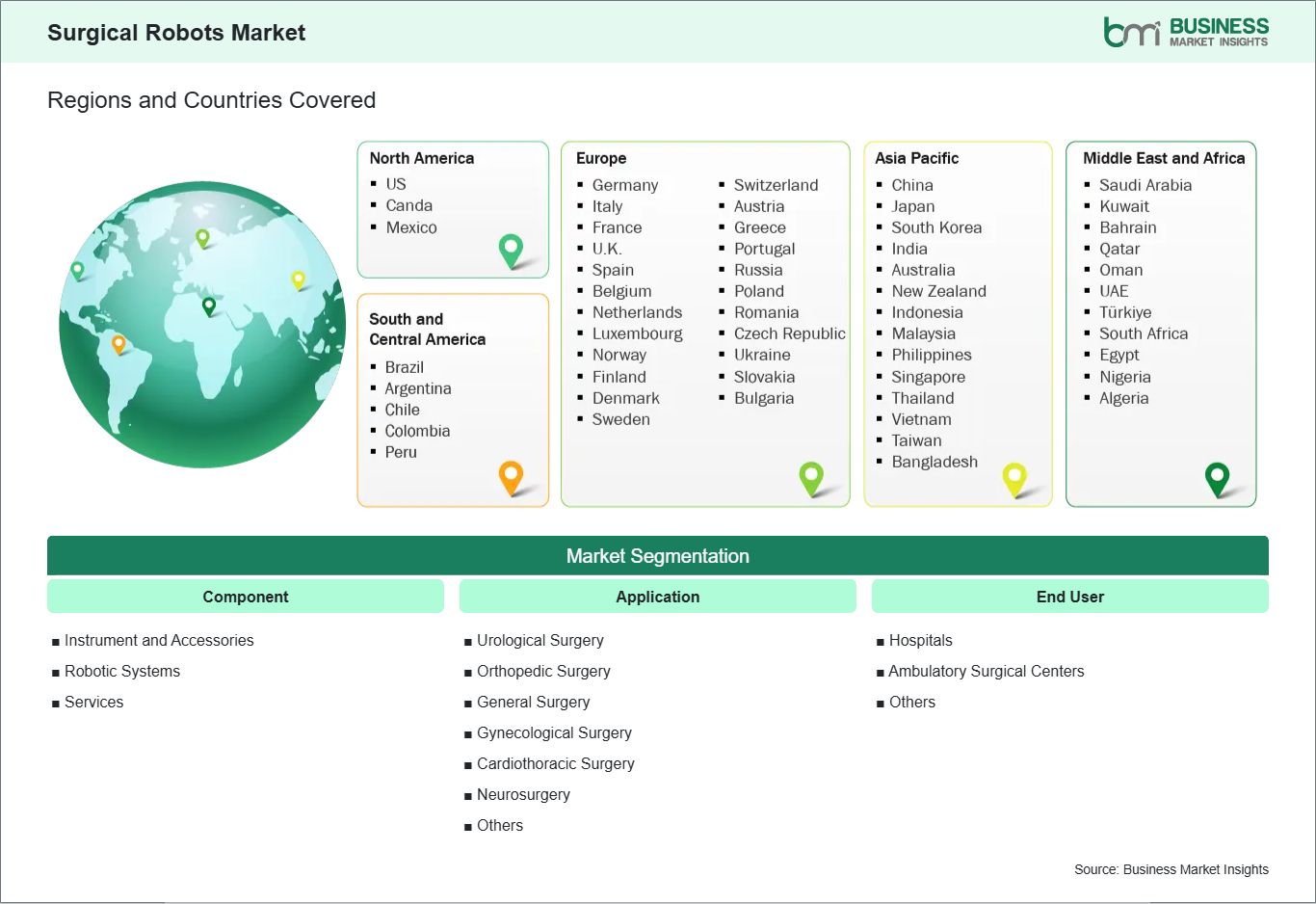 The geographical scope of the Surgical Robots Market report is divided into five regions: North America, Asia Pacific, Europe, Middle East & Africa, and South & Central America.