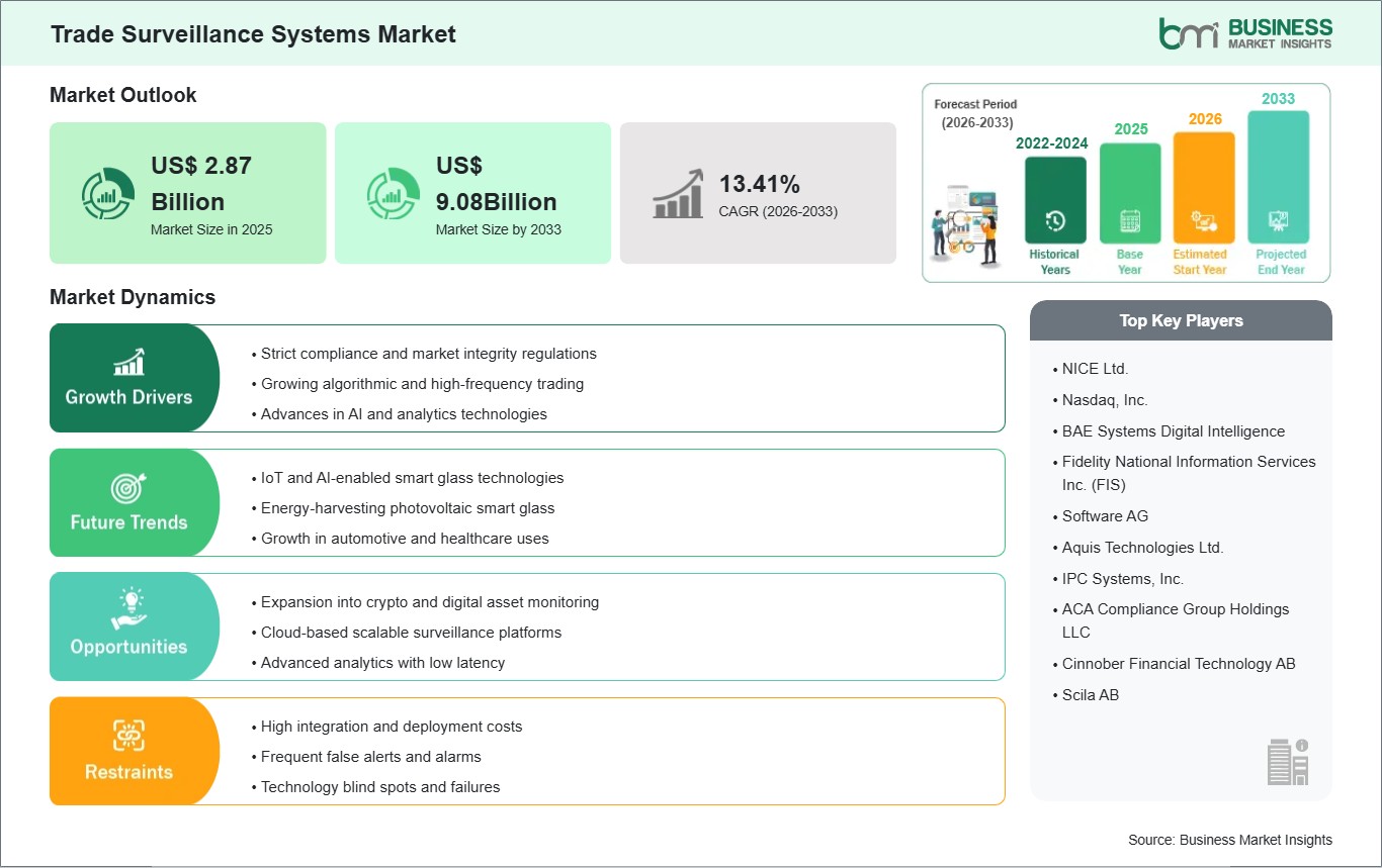 As per our report Trade Surveillance Systems Market, the market size is valued at US$ 2.87 Billion in 2025, projecting it to reach US$ 9.08Billion by 2033. This translates to a CAGR of approximately 13.41% during the forecast period.