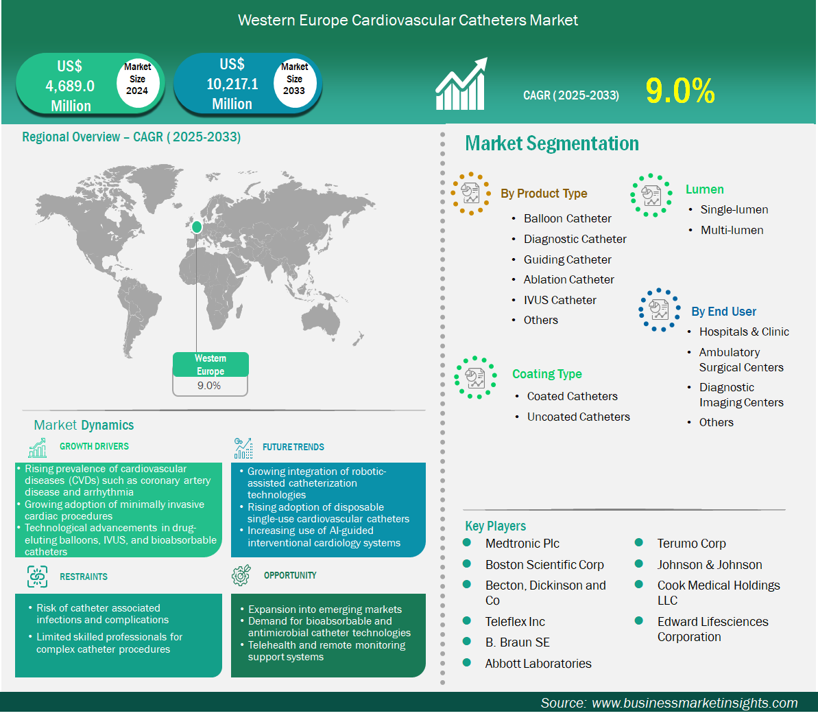 The Western Europe Cardiovascular Catheters Market is valued at US$ 4,689.0 Million in 2024, it is projected to reach US$ 10,217.1 Million by 2033.