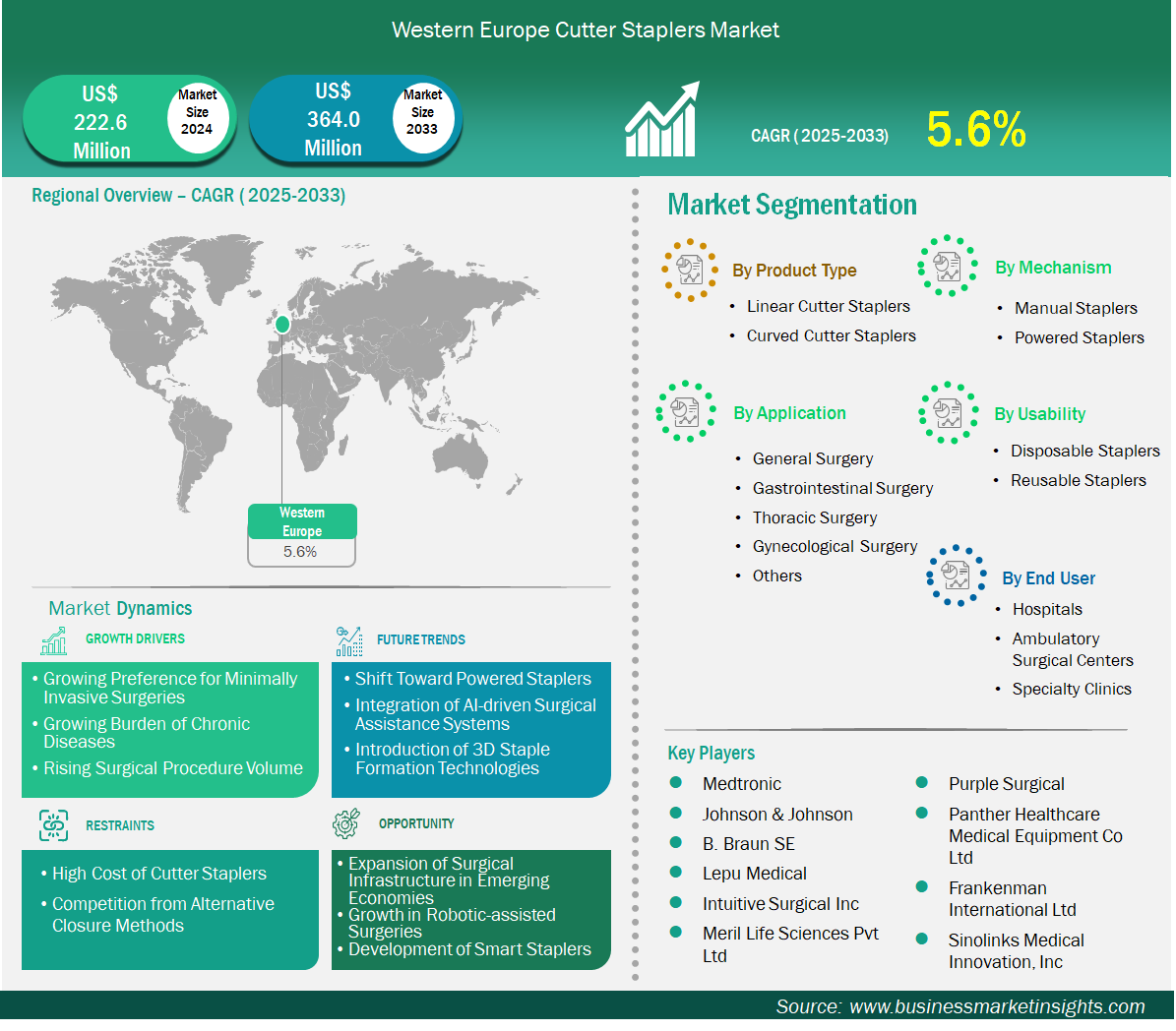 The Western Europe cutter staplers market size is expected to reach US$ 364.0 million by 2033 from US$ 222.6 million in 2024. The market is estimated to record a CAGR of 5.6% from 2025 to 2033.