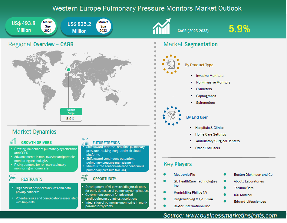 The Western Europe Pulmonary Pressure Monitors Market is valued at US$ 493.8 Million in 2024, it is projected to reach US$ 825.2 Million by 2033.