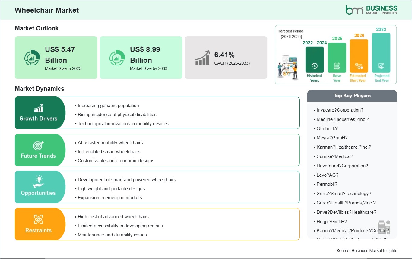 The Wheelchair Market is valued at US$ 5.47 Billion in 2025, it is projected to reach US$ 8.99 Billion by 2033.